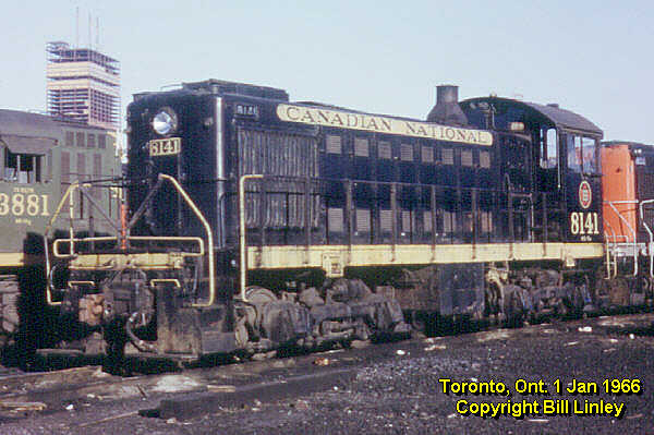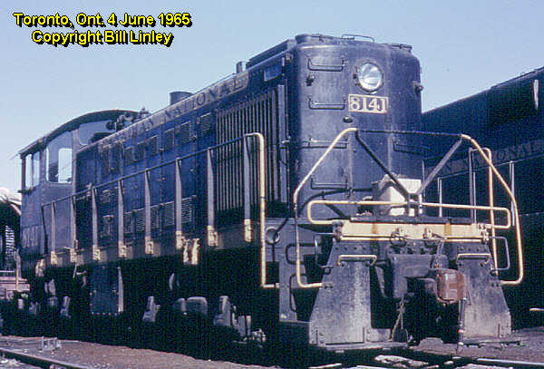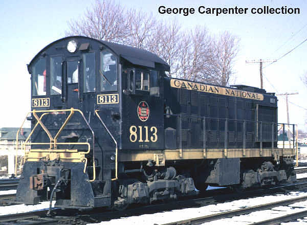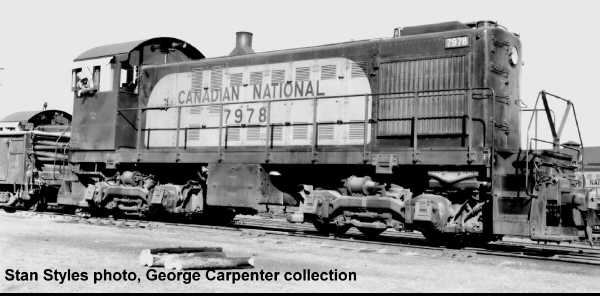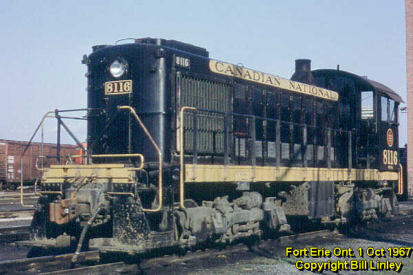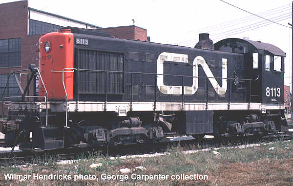 The S-2 was the first ALCO switcher purchased by Canadian National for operation on its Canadian lines, following an earlier delivery of 21 S-2s to the Grand Trunk Western and Central Vermont. CN bought 10 units built by ALCO in 1947 numbered 7946-7955 and renumbered 8112-8121 in 1956 (8119-8121 were transferred to GTW in 1968). In 1949 CN purchased a further 20 units built by MLW numbered 7975-7994 and later renumbered 8122-8141. All were built with Blunt trucks (designed by Mr. Blunt for ALCO and apparently very flexible so that they rode well on rough yard track), powered by a turbocharged 539 engine delivering 1000 hp. Each had a large jug-shaped stack (characteristic of a turbocharged engine) and rectangular side-mounted radiator shutter assemblies.