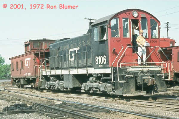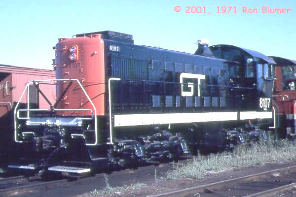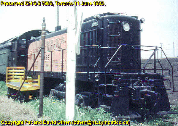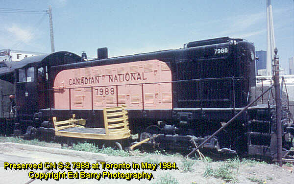 All CNR S-2s were delivered in black paint with Morency orange (CNR Orange No. 10) side panels with rounded corners (there are slight variations in the shape of the panel between ALCO and MLW produced units). ‘Canadian National’ in block letters, with the number below, was painted in black on this panel. The number was also painted on the nose and rear of the cab in yellow. Class numbers were located on the cab sides below the windows, although the first order of S-2s had the road number on the side of the cab as well. MLW-built 7978, at St Boniface, Man., in October 1949, wears this livery.This photo of preserved S-2 7988 show a colour re-creation of this paint scheme.This photo of preserved S-2 7988 show a colour re-creation of this paint scheme.After 1960 these units began to be repainted in the black and red-orange (officially CNR Orange No. 11) livery with the CN logo as seen in the photo of 8113 taken on 2 August 1969, again at Fort Erie, Ontario.In 1957 Railroad Roman style numbers began to replace the Gothic style. Seen at Fort Erie, Ontario on October 1 1967.At Toronto on June 4th 1967 8141 shows the Gothic lettering.8141 at Toronto Ontario on January 1st 1966.In 1957 Railroad Roman style numbers began to replace the Gothic style. Seen at Fort Erie, Ontario on 18 March 1965.Grand Trunk Western units received the black and orange livery with the GT logo and the size varied. 8106 is seen at Millwaukee Junction on June 1972.The photo of 8107 at Milwaukee Junction, MI in July 1971 illustrate the black and orange GTW livery with a smaller GT logo that avoids the louvers.This photo of 8120 also at Milwaukee Junction in September 1972 shows the blue and orange scheme.